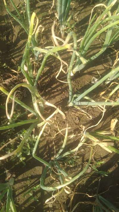 प्याज की पत्ती जली जली हो रही है और पौधा नीचे बैठ रहा है
