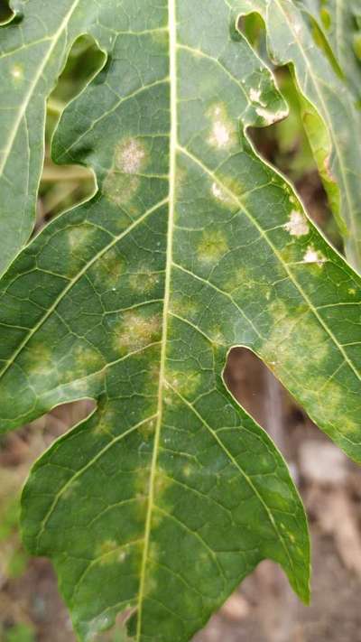 पपीता के पत्ते मे पीले रंग का गोलाकार आकृति का रोग है