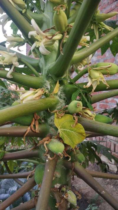 पपीते की डाल पर गोल गोल सफेद सफेद फफूदी लगी है और कालिया निकलती है तो पीली हो कर गिर जाती है