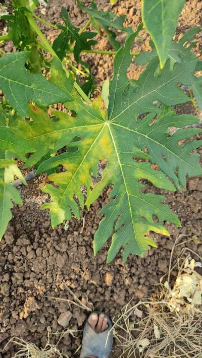 कुछ पपीता के पौधों के पत्ते इस प्रकार से बीच-बीच में पीले पड़े हैं
