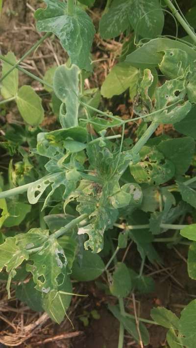 Matar ki pattiyon(leaves) par silver color ke dhabbe ho rahe hai aur pattiyon me hole(chhed) bhi ho .rahe hai. Kripa koi sujhav de. Dhanyawad....