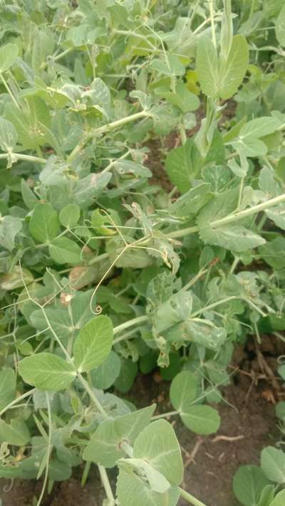 मटर के पोधे की पत्तियों का सिकुड़ना पौधे का सुख जाना फल नहीं लगना आदि।