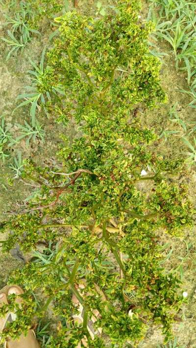 Mahesh यह Chilli Leaf Curl Virus का प्रभाव है। एकबार पौधा इस प्रकार के व्हायरस से प्रभावित होणे के बाद कोई उपचार उपलब्द नही है। शुरवात से ही सफेद मक्खी Whiteflies और Chilli Thrips का नियंत्रण करते रेहना चाहीये।