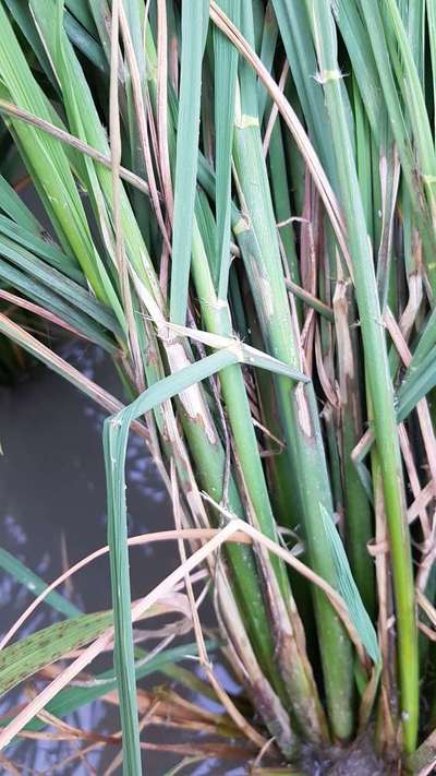 Sunil P यह Rice Sheath Blight रोग से ग्रसित है। विस्तृत जानकारी के लिए यहाँ क्लिक करें । शीथ ब्लाइट रोग में पत्तियों पर अनियमित आकार के धब्बे बनते हैं, जिसका किनारा गहरा भूरा और मध्य भाग हल्के रंग का होता है। झोका रोग में पतियों पर आँख की आकृति के धब्बे बनते हैं। जो मध्य में राख के रंग के और किनारे कत्थई रंग के होते हैं। पत्तियों के अतिरिक्त बालियों, डठलों, पुष्प शाखाओं और गाठों पर काले भूरे धब्बे बनते हैं। प्रबंधन : शीथ ब्लाइट व झोका दोनों रोगों के नियंत्रण के लिए हेक्साकोनाजोल 5 ई.सी. एक लीटर या कार्बेन्डाजिम 50 डब्लू.पी. 500 ग्राम को 500-750 लीटर पानी मे घोल कर प्रति हेक्टेयर की दर छिड़काव करें।