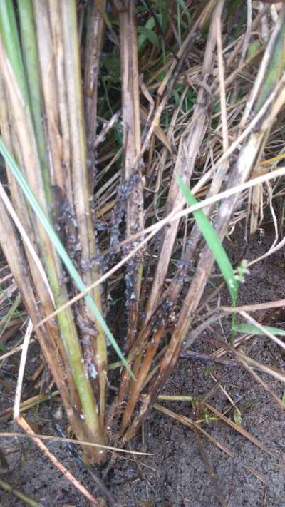 धान की बाली में पीले रंग के गाठे बनीहै