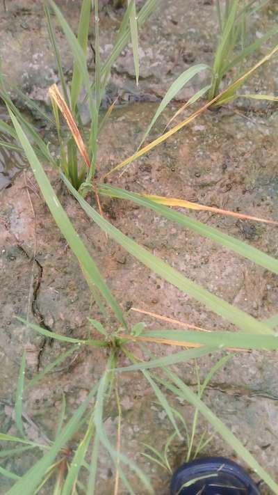 धान के पौधों की पत्तियां पीली होकर सड़ रही है।
