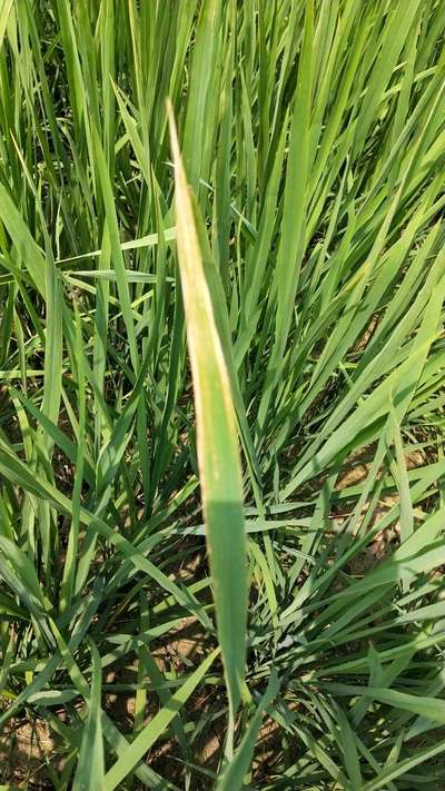 खेत के धान के सभी पौधों की पत्तियां सूख रही है।