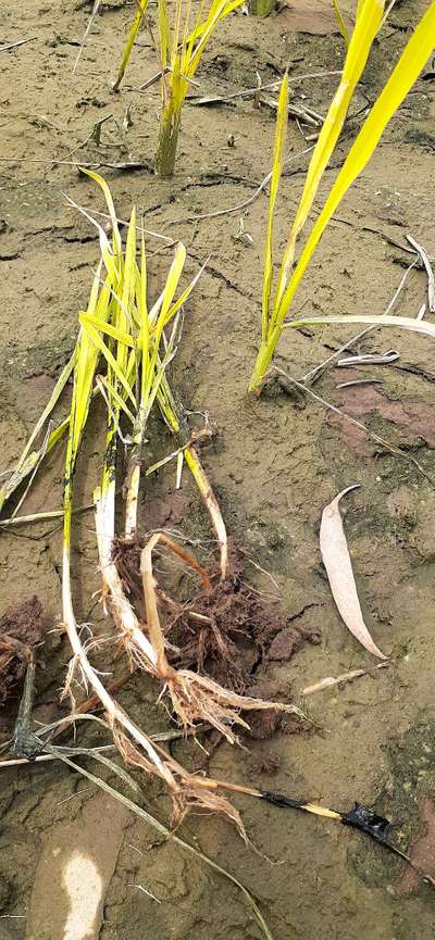 धान के पौधों की सुडी का लगना और उसकी पत्ती पीला होना की बीमार!