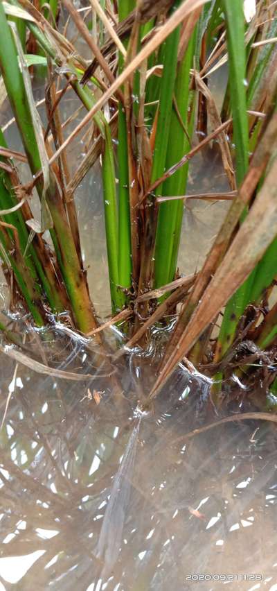 धान के नीचे की जड़ में सरन हो रही है ऊपर की पत्तियां सूख गई