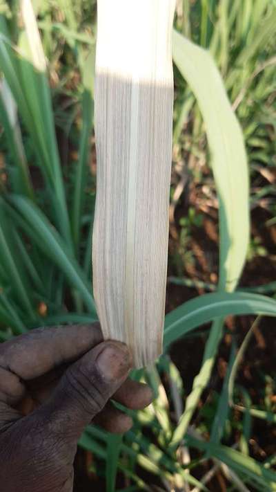 गन्ने की ऊपरी पत्तियों पर पीलापन और लाल रंग की कुछ धब्बे और शुक्ला पन।