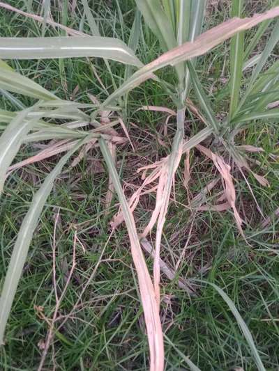 गन्ने की ऊपरी पत्तियों पर पीलापन और लाल रंग की कुछ धब्बे और शुक्ला पन।