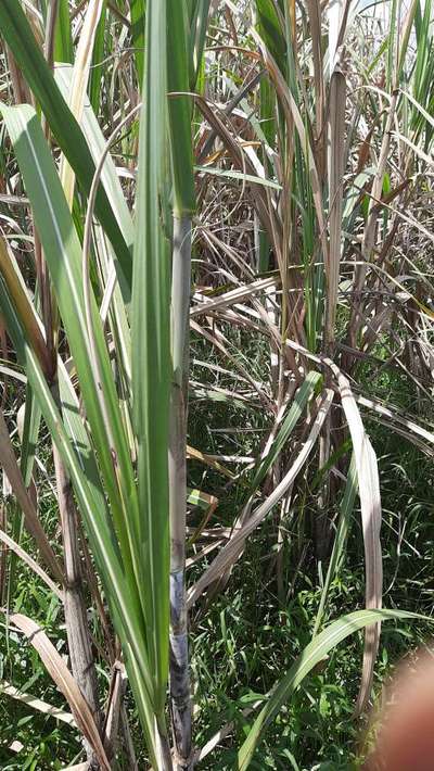 बीच का कल्ला पीला हो गया है जगा जगा पत्तिया सिकुड़ गई है और वही के टूट जा रही हैं और गन्ने का बड़वार रुक गया है