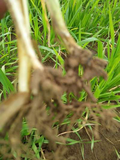 जड का मोटा होकर मिट्टी चिपक कर गेहूँ की पतियों का रंग पिला होगया है