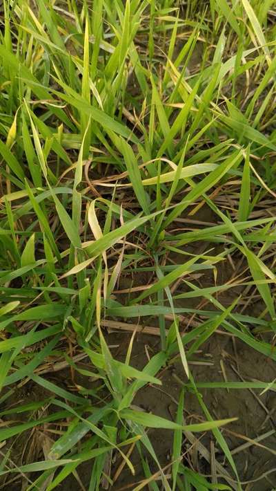 एक तिहाई से ज्यादा जो फसल है उसमें ऐसे ही दिख रहा है यह नीचे नीचे पत्तियां पीली दिख रही है ऊपर से कुछ पत्तियां हां थोड़ा-थोड़ा सूख रही है और यह साइड में मैंने साइड से 400 डाला है उसमें भी कोई द्वार नहीं दिख रहा है कृपया इसका निवारण बताइए