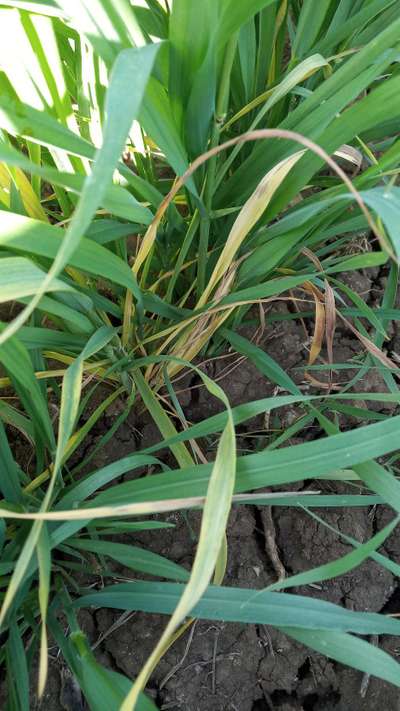 गेहूं की फसल की पत्तियां पीली पड़ गई है हल्दी की तरह पाउडर लगा हुआ है ।