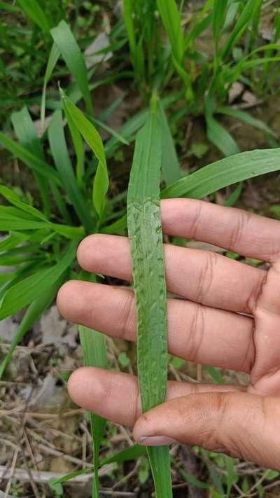 गेंहू की पत्तियों में एक तरफ गड्डेनुमा निशान व दूसरी तरफ उभार