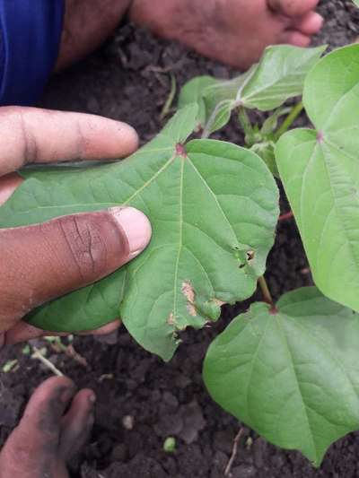 ಹೆಲೋ Shrikant. ಈ ಚಿತ್ರದ ಪ್ರಕಾರವಾಗಿ ತಮ್ಮ ಅನಿಸಿಕೆಯಂತೆ ಇದು Anthracnose of Cotton ರೋಗ ತಲುಲಿದೆ ಅನಿಸುತ್ತಿದೆ. ಆದರೆ ಖಾತ್ರಿ ಇಲ್ಲ. ಆದುದರಿಂದ ತಾವು ಇನ್ನೊಮ್ಮೆ ಇನ್ನಷ್ಟು ಕ್ಲಿಯರ್ ಇರುವ ಹತ್ತಿರದ ಹಗಲು ಹೊತ್ತಿನ ಸಮಯದಲ್ಲಿ ತೆಗೆದ ತೋಟದಲ್ಲಿನ ನೇರವಾದ ಚಿತ್ರಗಳ ಜೊತೆ ಸಮಂಜಸ ಪ್ರಶ್ನೆಗಳು.