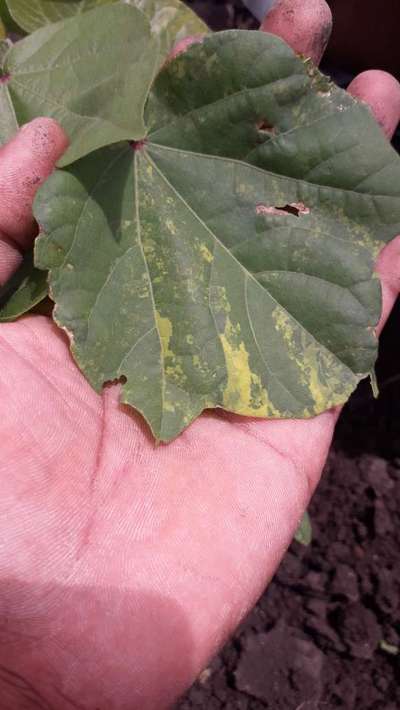 ಹೆಲೋ Shrikant. ಈ ಚಿತ್ರದ ಪ್ರಕಾರವಾಗಿ ತಮ್ಮ ಹತ್ತಿ ಬೆಳೆಗೆ ಪ್ರಾರಂಭ ಹಂತದ Leaf Variegation ಭಾಧೆ ತಗುಲಿದೆ ಅನಿಸುತ್ತಿದೆ. ಇಲ್ಲಿ ತೋರಿಸಿದ ಹಸಿರು ಬಣ್ಣದ ಅಕ್ಷರಗಳ ಲಿಂಕ್ ಮೇಲೆ ಬೆರಳು ಒತ್ತಿ ಹತೋಟಿ ಕ್ರಮಗಳು ಅನುಸರಿಸಿರಿ.