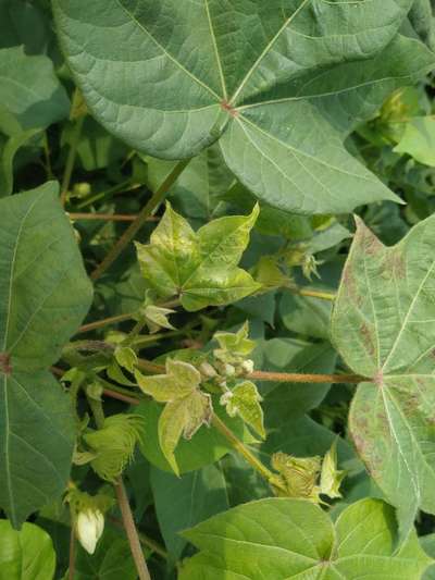 ಹೆಲೋ ಹಾಜಿಅಲಿ. ತಾವು ಯಾವುದಾದರು ಗೊಬ್ಬರಗಳ ಸಿಂಪರಣೆ ಮಾಡಿದ್ದೀರಾ ? ಏಕೆಂದರೆ, ಈ ಚಿತ್ರದ ಪ್ರಕಾರವಾಗಿ, ತಮ್ಮ ಹತ್ತಿ ಬೆಳೆಗೆ ತೀವ್ರಗತಿಯಲ್ಲಿ Fertilizer Burn ಆಗಿರಬಹು ಅನಿಸುತ್ತಿದೆ ಅಥವಾ ಜೊತೆಗೆ Calcium Deficiency ಕೊರತೆ ಕೂಡ ಇರಬಹುದು ಅನಿಸುತ್ತಿದೆ. ಆದುದರಿಂದ, ತಾವು ಇಲ್ಲಿ ತೋರಿಸಿದ ಹಸಿರು ಬಣ್ಣದ ಅಕ್ಷರಗಳ ಲಿಂಕಗಳ ಮೇಲೆ ಬೆರಳು ಒತ್ತಿ, ಪ್ಲ್ಯಾಟಿಕ್ಸ ಗ್ರಂಥಾಲಯವನ್ನು ಸಮ್ಪರ್ಕಿಸಿ ಗುಣಲಕ್ಷಣಗಳನ್ನು ಸರಿಯಾಗಿ ತಿಳಿದುಕೊಂಡು, ಅಲ್ಲಿ ತೋರಿಸಿದ ಸರಿಯಾದ ಮುಂಜಾಗರೂಕತೆಯ ಕ್ರಮಗಳು ಮತ್ತು ಚಿಕಿತ್ಸಾ ಕ್ರಮಗಳು ತಕ್ಷಣ ಅನುಸರಿಸಿರಿ. ಬೇರೆ ಏನಾದರು ತೊಂದರೆ ಇದ್ದರೆ, ಇನ್ನೊಮ್ಮೆ ಇನ್ನಷ್ಟು ಚಿತ್ರಗಳೊಂದಿಗೆ ಸಮಂಜಸ ಪ್ರಶ್ನೆಗಳ ಜೊತೆ ಸಮಂಜಸ ಪ್ರಶ್ನೆಗಳು ಕಳುಹಿಸಿ ಮಾಹಿತಿ ಪಡೆಯಿರಿ.