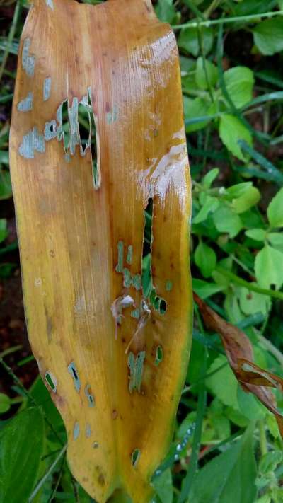 ಎಲೆಗಳು ತುಂಬಾನೆ ಹಳದಿ ಬಣ್ಣಕ್ಕೆ ತಿರುಗಿದ್ದು ಅಲ್ಲಲ್ಲಿ ರಂದ್ರಗಳಾಗಿವೆ
