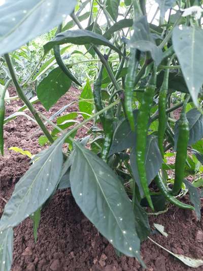 ಹೆಲೋ Bhagath. ಈ ಚಿತ್ರದ ಪ್ರಕಾರವಾಗಿ, ತಮ್ಮ ಮೆಣಸಿನಕಾಯಿ ಬೆಳೆಗೆ ಪ್ರಾರಂಭ ಹಂತದ Flea Beetles ಕೀಟ ಮತ್ತು Powdery Mildew of Pepper ರೋಗದ ಭಾಧೆ ತಗುಲಿದೆ ಅನಿಸುತ್ತಿದೆ. ಆದರೆ ಖಾತ್ರಿ ಇಲ್ಲ. ಆದುದರಿಂದ ತಾವು ಇಲ್ಲಿ ತೋರಿಸಿದ ಹಸಿರು ಬಣ್ಣದ ಅಕ್ಷರಗಳ ಲಿಂಕಗಳ ಮೇಲೆ ಬೆರಳು ಒತ್ತಿ ಹತೋಟಿ ಕ್ರಮಗಳು ಅನುಸರಿಸಿರಿ. ತಮ್ಮ ಮೆಣಸಿನಕಾಯಿ ಬೆಳೆಯ ಒಳ್ಳೆಯ ಬೆಳವಣಿಗೆ ಮತ್ತು ಇಳುವರಿ ಪಡೆಯಲು ಸಾಕಷ್ಟು ಪ್ರಮಾಣದಲ್ಲಿ ಕೊಟ್ಟಿಗೆ ಗೊಬ್ಬರ ಮತ್ತು ಶಿಫಾರಸಿನ ಪ್ರಮಾಣದಲ್ಲಿ ರಾಸಾಯನಿಕ ಗೊಬ್ಬರಗಳು ಹಂತ ಹಂತವಾಗಿ ಕೊಡಬೇಕು ಅಥವಾ ಇಲ್ಲಿ ಪ್ಲ್ಯಾಟಿಕ್ಸ ನ ಹೊಂ ಪೇಜನಲ್ಲಿ ಕೊಟ್ಟಿರುವ ರಸಗೊಬ್ಬರಗಳ ಕ್ಯಾಲ್ಕುಲೇಟರ ಬಳಸಿಕೊಂಡು ರಾಸಾಯನಿಕ ಗೊಬ್ಬರಗಳು ಹಂತ ಹಂತವಾಗಿ ಕೊಡಬಹುದು. ಜೊತೆಗೆ ತಾವು ಪ್ಲಾಂಟಿಕ್ಸ್ ನ ಹೊಂ ಪೇಜನಲ್ಲಿ ಕೊಟ್ಟಿರುವ ಮೆಣಸಿನಕಾಯಿ ಬೆಳೆಯ ಸಲಹೆಯನ್ನು ರಚಿಸಿಕೊಳ್ಳಿರಿ . ಇದು ನಿಮ್ಮಬೆಳೆಯ ಉತ್ಪಾದನೆಯನ್ನು ಹೇಗೆ ಉತ್ತಮಗೊಳಿಸಬಹುದು ಎಂಬುದರ ಕುರಿತು ಮಾಹಿತಿಯನ್ನು ಒದಗಿಸುತ್ತದೆ.