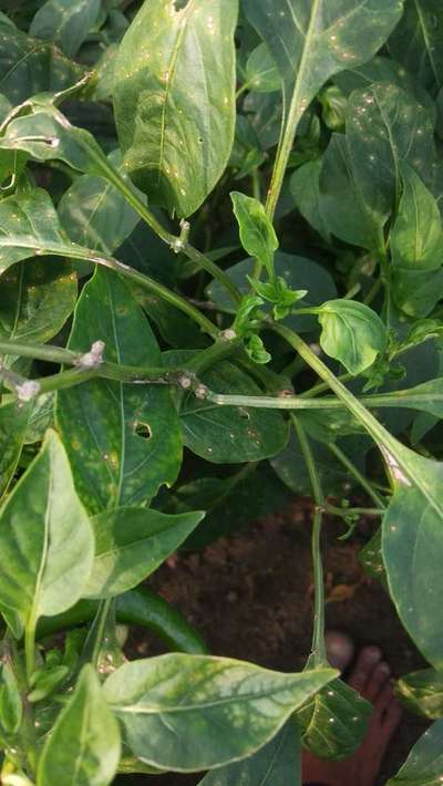 ಹೆಲೋ Veeresh Gowda U. ಸರಿ. ಈಗ, ಈ ಚಿತ್ರದ ಪ್ರಕಾರವಾಗಿ, ತಮ್ಮ ಮೆಣಸಿನಕಾಯಿ ಬೆಳೆಗೆ ತೀವ್ರಗತಿಯಲ್ಲಿ Bacterial Spot of Pepper ರೋಗ ಮತ್ತು ಪ್ರಾರಂಭ ಹಂತದ Magnesium Deficiency ಕೊರತೆ ಕಂಡು ಬಂದಿದೆ ಅನಿಸುತ್ತಿದೆ. ಇಲ್ಲಿ ತೋರಿಸಿದ ಹಸಿರು ಬಣ್ಣದ ಅಕ್ಷರಗಳ ಲಿಂಕಗಳ ಮೇಲೆ ಬೆರಳು ಒತ್ತಿ ಪ್ಲ್ಯಾಟಿಕ್ಸ ಗ್ರಂಥಾಲಯವನ್ನು ಸಮ್ಪರ್ಕಿಸಿ, ಅಲ್ಲಿ ತೋರಿಸಿದ ಸರಿಯಾದ ಮುಂಜಾಗರೂಕತೆಯ ಕ್ರಮಗಳು ಮತ್ತು ಚಿಕಿತ್ಸಾ ಕ್ರಮಗಳು ಅನುಸರಿಸಿರಿ.