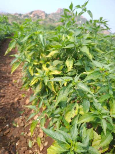 ಹೆಲೋ D. Laxmana. ಈ ಚಿತ್ರದ ಪ್ರಕಾರವಾಗಿ, ತಮ್ಮ ಮೆಣಸಿನಕಾಯಿ ಬೆಳೆಗೆ Chilli Thrips ಕೀಟ ಮತ್ತು Nitrogen Deficiency ಕೊರತೆ ಕಂಡು ಬಂದಿದೆ ಅನಿಸುತ್ತಿದೆ. ಇಲ್ಲಿ ತೋರಿಸಿದ ಹಸಿರು ಬಣ್ಣದ ಅಕ್ಷರಗಳ ಲಿಂಕಗಳ ಮೇಲೆ ಬೆರಳು ಒತ್ತಿ ಪ್ಲ್ಯಾಟಿಕ್ಸ ಗ್ರಂಥಾಲಯವನ್ನು ಸಮ್ಪರ್ಕಿಸಿ, ಗುಣಲಕ್ಷಣಗಳನ್ನು ಸರಿಯಾಗಿ ತಿಳಿದುಕೊಂಡು, ಅಲ್ಲಿ ತೋರಿಸಿದ ಸರಿಯಾದ ಮುಂಜಾಗರೂಕತೆಯ ಕ್ರಮಗಳು ಮತ್ತು ಚಿಕಿತ್ಸಾ ಕ್ರಮಗಳು ಅನುಸರಿಸಿರಿ.