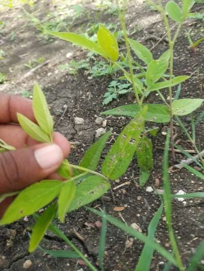 ತೊಗರಿಯಲ್ಲಿ ಎಳೆಗಳ ಮೇಲೆ ಬಿಳಿ ಬಣ್ಣದ ಚುಕ್ಕಿಗಳು ಹಾಗೂ ಎಲೆಯಲ್ಲಿ ರಂಧ್ರ