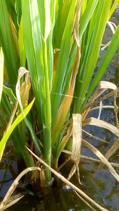 ಹೆಲೋ ರವಿ. ಇದು Bacterial Leaf Streak ಇರಬಹುದು ಅನಿಸುತ್ತಿದೆ. ಆದರೆ ಖಾತ್ರಿ ಇಲ್ಲ. ಆದುದರಿಂದ ತಾವು ಇಲ್ಲಿ ತೋರಿಸಿದ ಹಸಿರು ಬಣ್ಣದ ಅಕ್ಷರಗಳ ಲಿಂಕ ಮೇಲೆ ಬೆರಳು ಒತ್ತಿ ಪ್ಲ್ಯಾನಟಿಕ್ಸ ಗ್ರಂಥಾಲಯವನ್ನು ಸಮ್ಪರ್ಕಿಸಿ ಗುಣಲಕ್ಷಣಗಳನ್ನು ಸರಿಯಾಗಿ ಪರೀಕ್ಷಿಸಿ ಹತೋಟಿಯ ಕ್ರಮಗಳು ಅನುಸರಿಸಿರಿ. ಇದಲ್ಲದೆ, ತಾವು ಪ್ಲ್ಯಾನಟಿಕ್ಸ ನ ಹೊಂ ಪೇಜನಲ್ಲಿ ತಮ್ಮ ಅನುಕೂಲಕ್ಕೆ ಕೊಟ್ಟಿರುವ "ರಸಗೋಬ್ಬರ ಕ್ಯಾಲ್ಕುಲೇಟರ","ಬೆಳೆ ಸಲಹೆ" "ಸಸ್ಯಕ ಹಂತ" ದ "ಎಲ್ಲಾ ಕಾರ್ಯಗಳು ನೋಡಿ",ಮತ್ತು "ಹವಾಮಾನ ವರದಿ" ಎನ್ನುವ ವಿಭಾಗಗಳನ್ನು ಉಪಯೋಗಿಸಿಕೊಂಡು ಸಮಯಕ್ಕೆ ಸರಿಯಾದ ಕ್ರಮಗಳು ಅನುಸರಿಸಿರಿ. ಇವು ನಿಮಗೆ ಬೆಳೆಯ ಉತ್ಪಾದನೆಯನ್ನು ಹೇಗೆ ಉತ್ತಮಗೊಳಿಸಬಹುದು ಎಂಬುದರ ಕುರಿತು ಮಾಹಿತಿ ಒದಗಿಸುತ್ತವೆ.