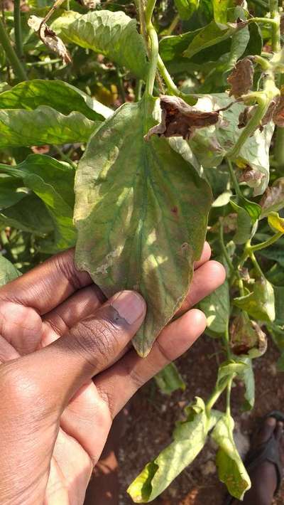 Hi Shubhakara N . I suspect, it looks like Leaf Mold of Tomato , but not sure. It's also associated with ="_blank" href="/kn/library/plant-diseases/600003/thrips/">Thrips . Let's click on green link for checking symptoms and taking control measures.
