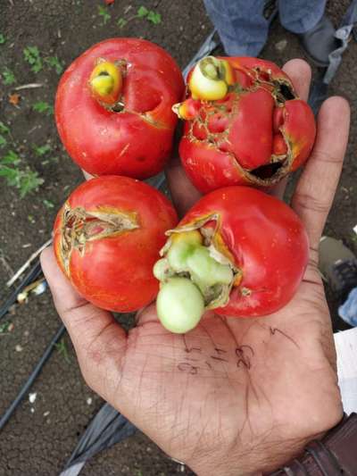 ಹೆಲೋ Ravindra Jatgond. ಇಂಥಾ ಲಕ್ಷಣಗಳು ಕೆಲವು ಟೊಮ್ಯಾಟೊ ತಳಿಗಳಲ್ಲಿ ಕಂಡು ಬರುತ್ತದೆ. ಇದನ್ನು Tomato Catface ಮತ್ತು Growth Cracks in Tomato ಇದೆ ಅನಿಸುತ್ತಿದೆ. ತಾವು ಈಗ ಇಲ್ಲಿ ತೋರಿಸಿದ ಹಸಿರು ಬಣ್ಣದ ಅಕ್ಷರಗಳ ಲಿಂಕ್ಗಳ ಮೇಲೆ ಬೆರಳು ಒತ್ತಿ ಪ್ಲ್ಯಾನಟಿಕ್ಸ ಗ್ರಂಥಾಲಯವನ್ನು ಸಮ್ಪರ್ಕಿಸಿ ಗುಣಲಕ್ಷಣಗಳನ್ನು ತಿಳಿದುಕೊಂಡು ಹತೋಟಿ ಕ್ರಮಗಳು ಅನುಸರಿಸಿರಿ.