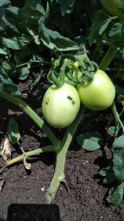 ಹೆಲೋ Ameer Pasha. ಇದು Bacterial Canker of Tomato ಅಥವಾ Helicoverpa Caterpillar ಕೀಟದ ರಂದ್ರ ಇರುವಂತೆ ತೋರುತ್ತಿದೆ. ಆದುದರಿಂದ ತಾವು ಇಲ್ಲಿ ತೋರಿಸಿದ ಎರಡೂ ಹಸಿರು ಬಣ್ಣದ ಅಕ್ಷರಗಳ ಲಿಂಕ್ಗಳ ಮೇಲೆ ಬೆರಳು ಒತ್ತಿ ಪ್ಲ್ಯಾನಟಿಕ್ಸ ಗ್ರಂಥಾಲಯವನ್ನು ಸಮ್ಪರ್ಕಿಸಿ ಗುಣಲಕ್ಷಣಗಳನ್ನು ತಿಳಿದುಕೊಂಡು ಹತೋಟಿ ಕ್ರಮಗಳು ಅನುಸರಿಸಿರಿ.