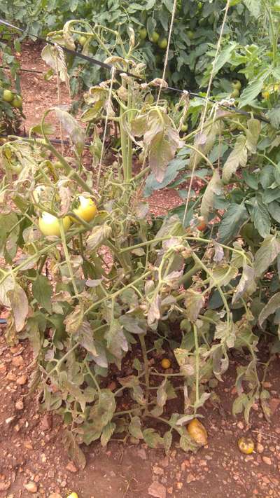 ಮಳೆ ಹೆಚ್ಚಾದ ಪರಿಣಾಮ ತೇವಾಂಶ ಹೆಚ್ಚಾಗಿ ಟೊಮೊಟೊ ಗಿಡಗಳು ಹಳದಿಯಾಗುತ್ತಿವೆ ಕಾಯಿಗಳು ಮತ್ತು ಹೂಗಳು ಉದುರುತ್ತಿವೆ......ದಯವಿಟ್ಟು ಉತ್ತಮ ಇಳುವರಿ ಪಡೆಯಲು ಉತ್ತಮವಾದ ಔಷಧಿಯ ಹೆಸರನ್ನು ಹೇಳಿ..