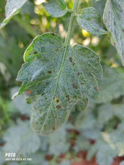 ಹೆಲೋ Krishna Km. ಈ ಚಿತ್ರದ ಪ್ರಕಾರವಾಗಿ, ತಮ್ಮ ಟೊಮೆಟೊ ಬೆಳೆಗೆ ತೀವ್ರಗತಿಯಲ್ಲಿ Early Blight ಮತ್ತು Powdery Mildew ರೋಗ ತಲುಲಿದೆ ಅನಿಸುತ್ತಿದೆ. ಇಲ್ಲಿ ತೋರಿಸಿದ ಹಸಿರು ಬಣ್ಣದ ಅಕ್ಷರಗಳ ಲಿಂಕಗಳ ಮೇಲೆ ಬೆರಳು ಒತ್ತಿ, ಪ್ಲ್ಯಾಟಿಕ್ಸ ಗ್ರಂಥಾಲಯವನ್ನು ಸಮ್ಪರ್ಕಿಸಿ, ಗುಣಲಕ್ಷಣಗಳನ್ನು ಸರಿಯಾಗಿ ತಿಳಿದುಕೊಂಡು, ಅಲ್ಲಿ ತೋರಿಸಿದ ಸರಿಯಾದ ಮುಂಜಾಗರೂಕತೆಯ ಕ್ರಮಗಳು ಮತ್ತು ಚಿಕಿತ್ಸಾ ಕ್ರಮಗಳು ತಕ್ಷಣ ಅನುಸರಿಸಿರಿ.