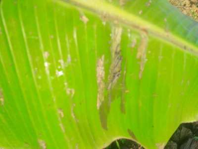 വാഴ തൈ യുടെ ഇലകൾക്ക് വെള്ള നിറം കാണപ്പെടുന്നു വെള്ള നിറം കാണുന്ന ഇലയുടെ അടിഭാഗം ഉണങ്ങുന്ന തായി കാണുന്നു
