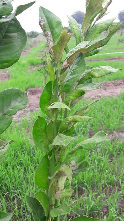 नवतीची पाने पीवळी पडली व त्या वर माग च्या बाजुला सर्प आकारा च्या खुना आहे