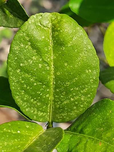 लिंबाचे सर्व पानावर असे ठिपके. काही ठिकाणी पानाची सुरळी.