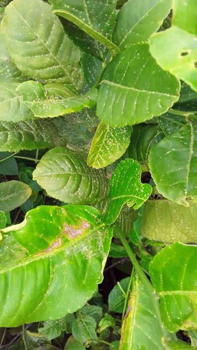पानावर कोकडा पडल्यागत स्थिती, तसेच पाने कुरतडलेले आहेत