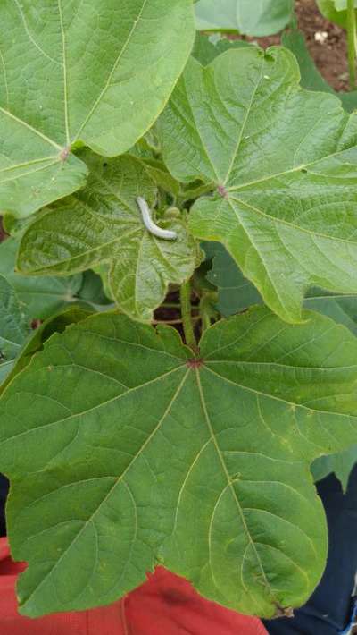 हिरव्या रंगाची अळी व पांढरे लालसर डाग कापूस पिकांवरती आहे