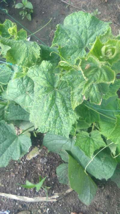 काकडी च्या काही झाडांच्या पानांना पिवळेपणा आहे. आणि काही झाडांची पानांच्या शिरा हिरव्या होत आहे. फोटो मध्ये दाखवल्या प्रमाणे