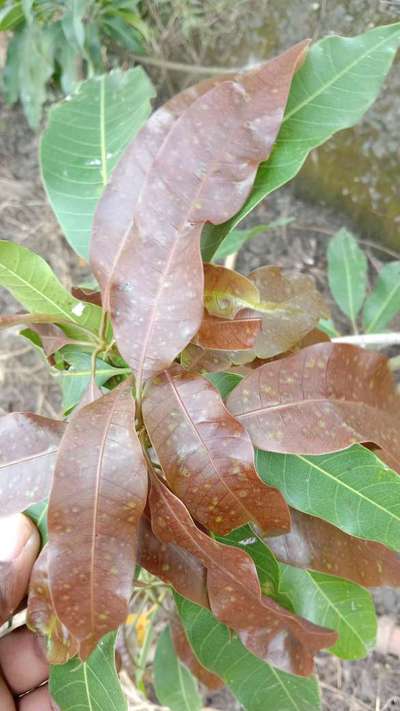 4 ते 5 आंब्याची नवीन पालवी अश्या प्रकारे सुकून जात आहे . काही पानांची पालवी खाऊन कुर्तडली आहे काही दिवसांपूर्वी super phosphate दिले आहे .