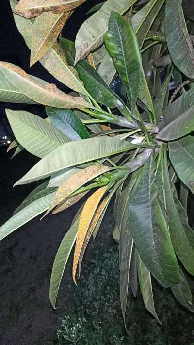पानांच्या मागील बाजूस केशरी रंगाची किड चढली आहे त्यामुळे पाने करपत आहेत.