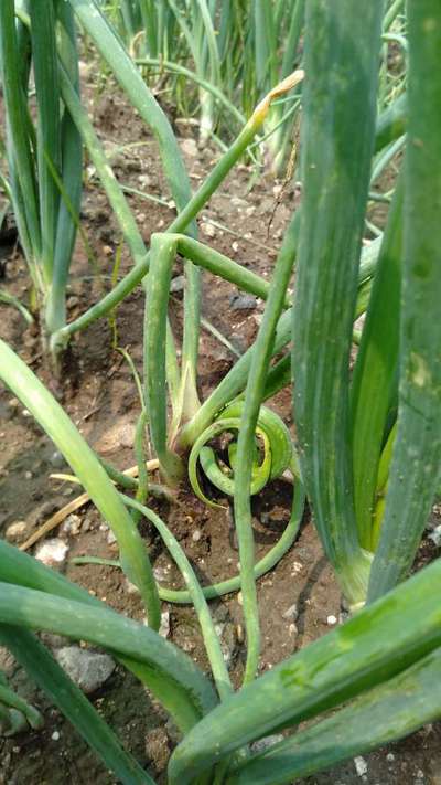 कांद्याची पात वाकडी व्हायला लागली आहे आणि पांढरे ठिपके पडलेले आहेत