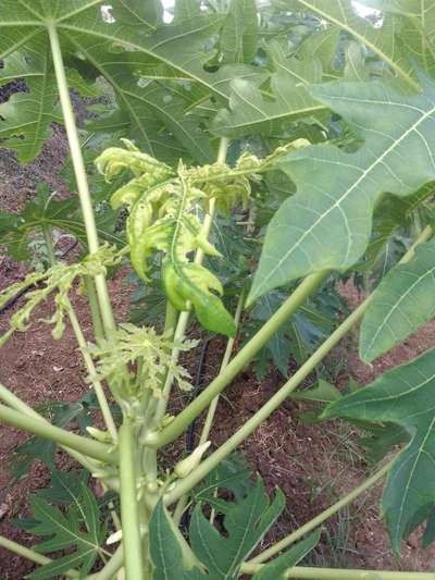 पपेई वर फोटोट दाखवल्या प्रमाणे पाने व सेन्डा अकड़ने व पीवले पड़ने चालू आहे