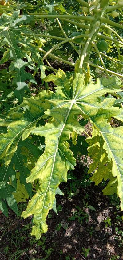 पपई ची पाने गुंडाळत आहे आणि काही झाडाची पाने पिवडी पडत आहे फळ फुल गळत आहे