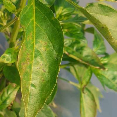 पानावर तांबुस रंगाचे ठिपके आहेत, कोवळी पाने आकडली जात आहेत.
