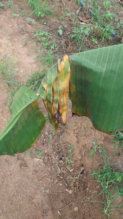 Algumas folhas da bananeira começam a se deformar, se partem e enrolam-se como nas fotos.
