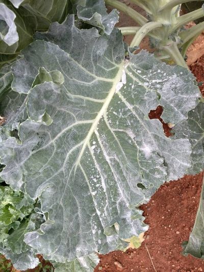 Alguém saberia me dizer o que são essas manchas que surgiram em minha couve? Ela só aparece nas folhas mais velhas, em algumas chega a acumular essa coisa branca em cima das folhas.