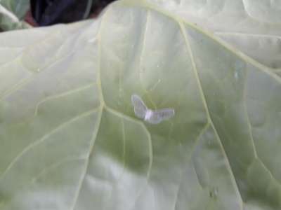 Saiba mais sobre o PlantixEla é branca e estava na parte de baixo da folha de couve.