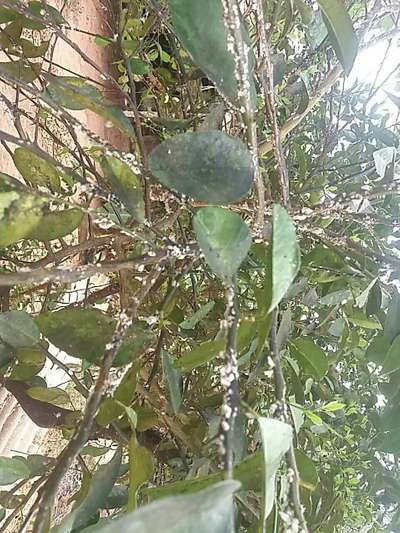 Eu tirei foto, mas o App não identifica correto está formação estranha no galho. As folhas tão muito escuras, acinzentadas, parecem mofadas. Mas o que me assusta e está formação no galho dela. Alguém sabe o que é?